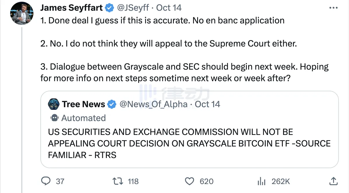 此前在10 月 14 日,彭博社 ETF 分析师 James Seyffart 在社交媒体上发文表示,灰度和 SEC 之间的对话将于下周开始,SEC 很可能会在未来 2 周内,对灰度提出的「GBTC 转换为比特币现货 ETF」申请做出新的回应。