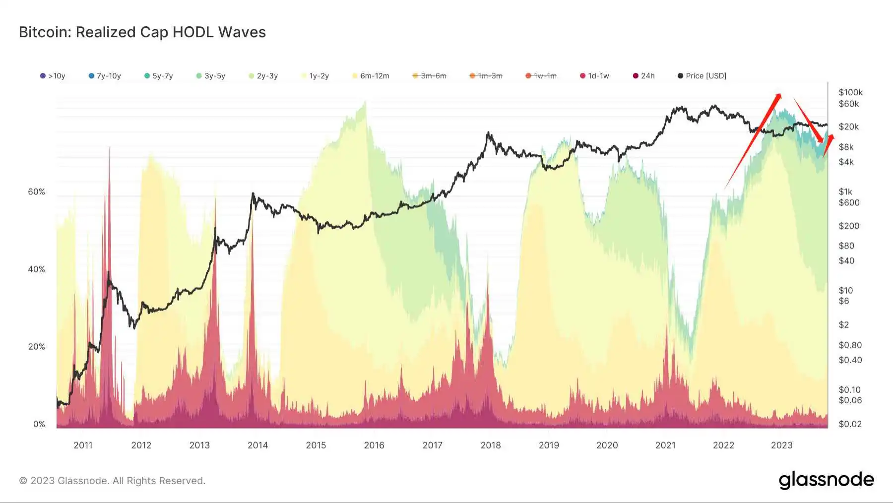 在 BTC 市价低于短期参与者的成本持有价格时,可能市场会迎来⼀定程度的低迷修复阶段。