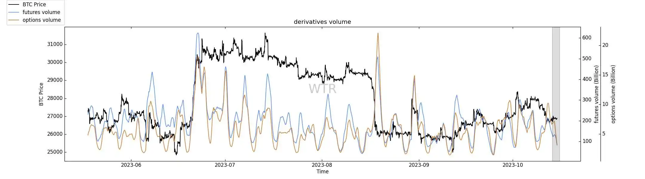 当前衍⽣品成交量⽆太多波动仍处于低位⽔平,表明当前衍⽣品交易者持观望状态较多。