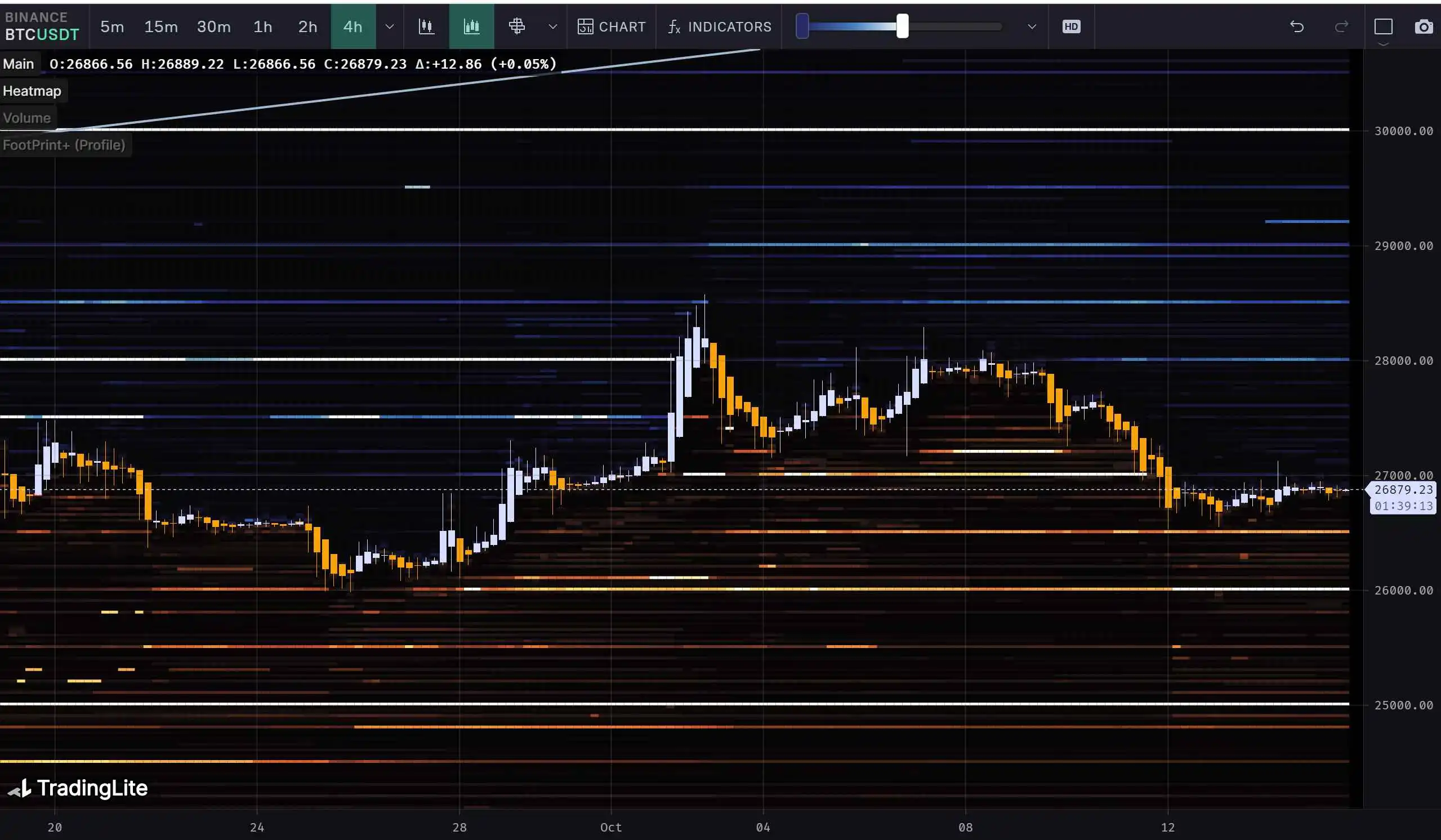 本周从 10⽉9⽇到 10⽉16⽇,冰糖橙最⾼附近$27987,最低接近$26538,震荡幅度达到 5.18% 左右。 观察筹码分布图,在约 26770 附近有⼤量筹码成交,将有⼀定的⽀撑或压⼒。