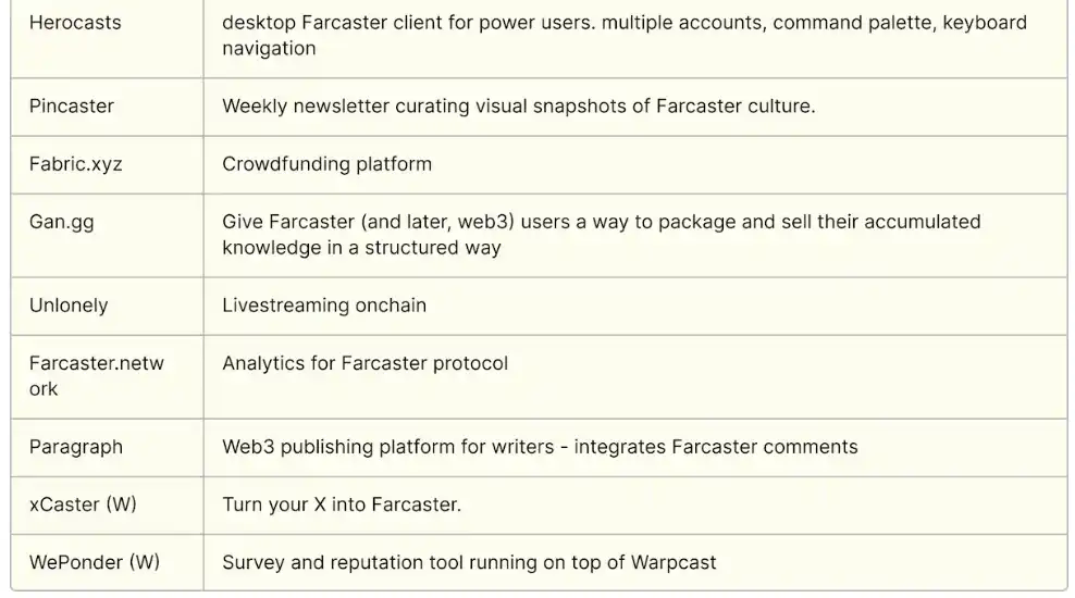 增强 Warpcast 应用程序的项目:用于创建事件的 Eventcaster、搜索帖子或人员的 Searchaster 和 Findcaster、用于发掘项目的 Launcaster、用于在 Warpcast feed 中嵌入小型应用程序的 Discove、Weponder 用于在 Warpcast 上创建调查等等。