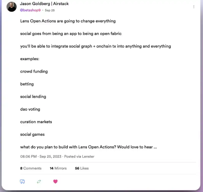 Airstack 创始人 Jason Goldberg 称赞 Open Actions