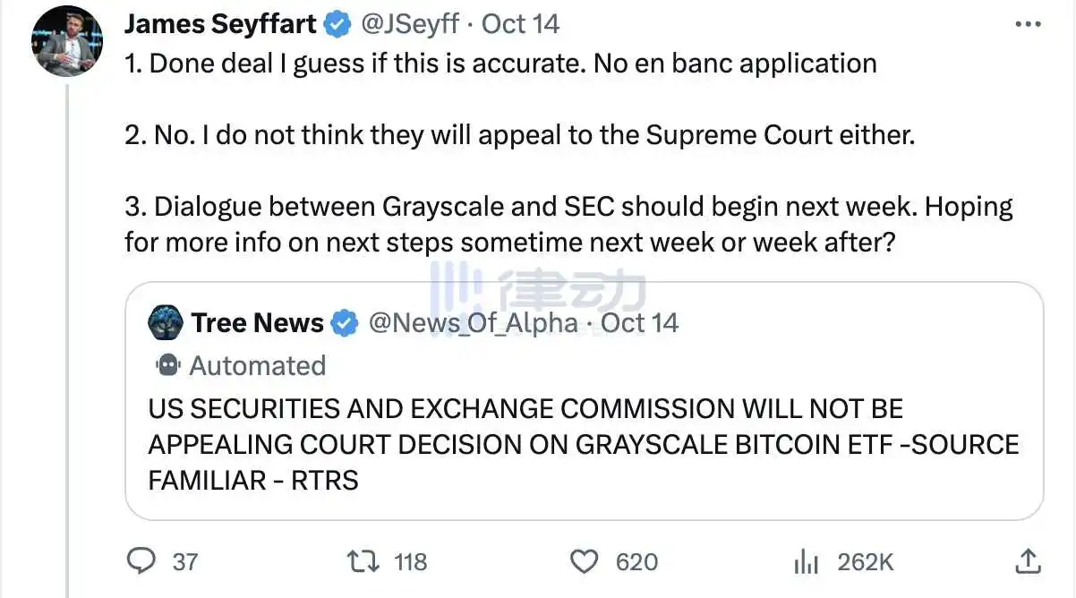 但此前在10 月 14 日,彭博社 ETF 分析师 James Seyffart 在社交媒体上发文表示,灰度和 SEC 之间的对话将于下周开始,SEC 很可能会在未来 2 周内,对灰度提出的「GBTC 转换为比特币现货 ETF」申请做出新的回应。