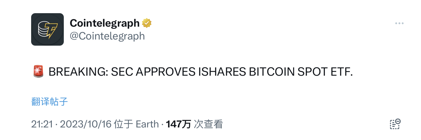 两个小时前,同样的事情再次上演,比特币 ETF 被 SEC 批准的消息被加密货币老牌媒体 Cointelegraph 以全大写字母的「震撼体」发布在社交媒体,市场随即而动。市值 5500 亿美元的比特币连破多个整数位,站上 3 万美元。牛市回归。不到半个小时,这条推文的阅读量接近 150 万,你很难想象 Crypto 行业居然还有这么多人。