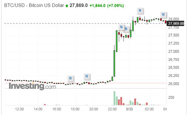 美股早盘时段,比特币现货交易价迅速从略低于2.6万美元跳涨至2.7万美元上方,午盘更是一度突破2.81万美元,创8月17日以来盘中新高,较欧股盘中的日内低位暴拉超过2200美元、涨近9%。