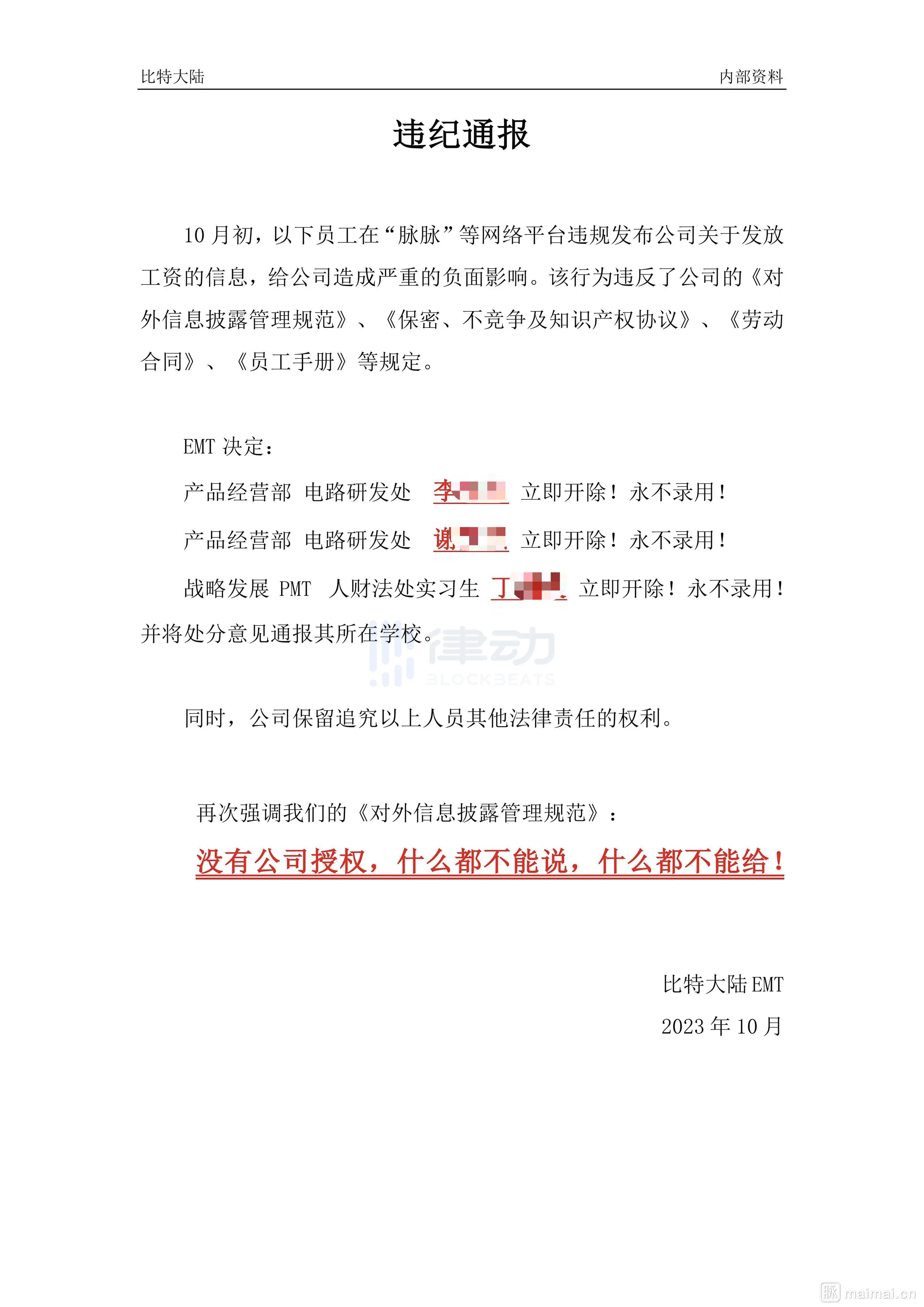 比特大陆对三名「泄露工资拖欠」信息的员工予以开除处理