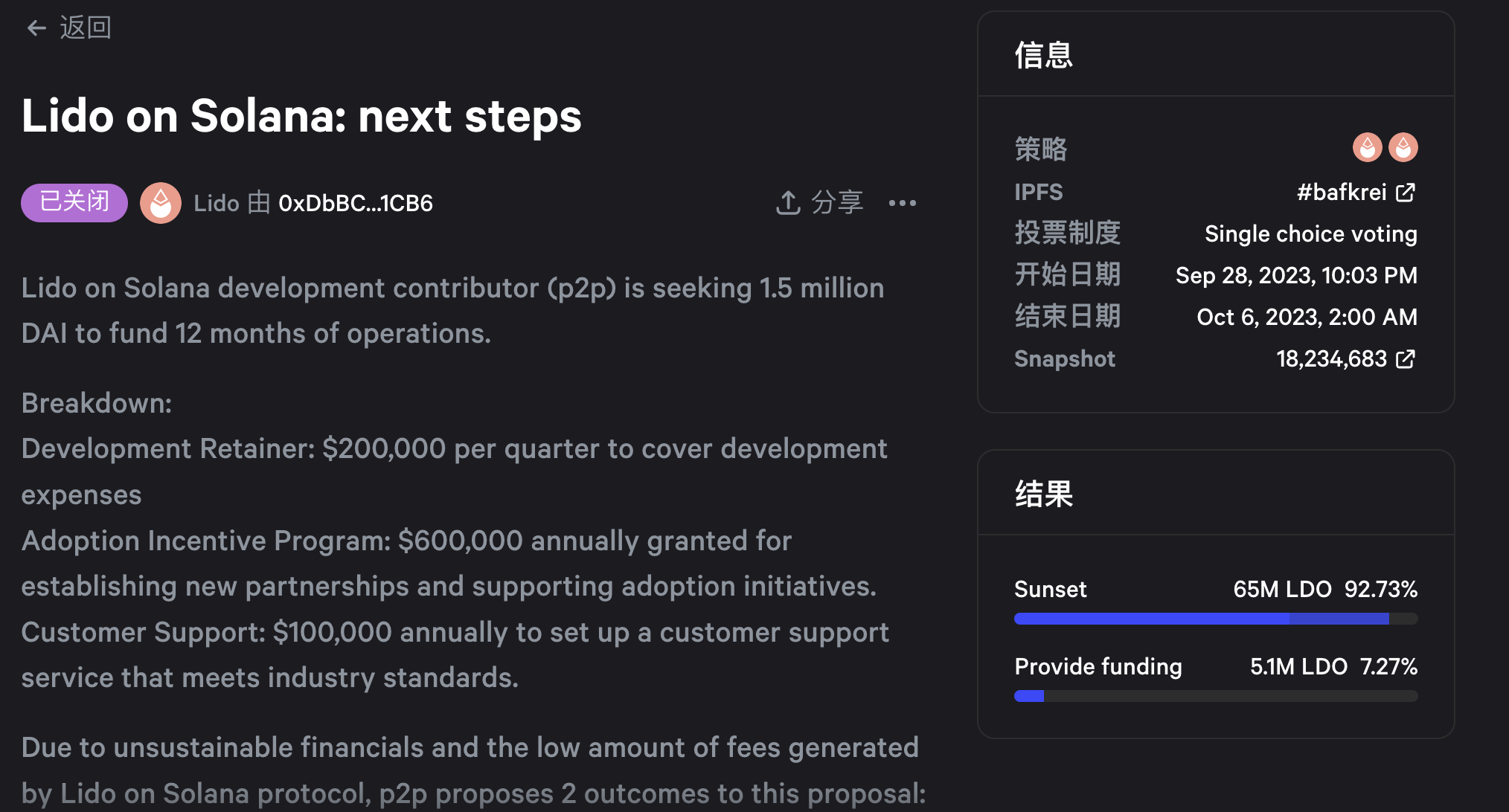 消息,10 月 16 日,LSD 赛道龙头 Lido 宣布停止在 Solana 上接受新的抵押,其在 Solana 上的项目将在未来几个月内逐步终止。据 Lido 官方 blog 发布的声明显示,此决定是在 Lido DAO 论坛上经过深入讨论,并经社区投票后由 Lido 代币持有者批准的。据 snapshot 数据显示,本次投票赞成退出 Solana 的成员占比达到 92.73%。