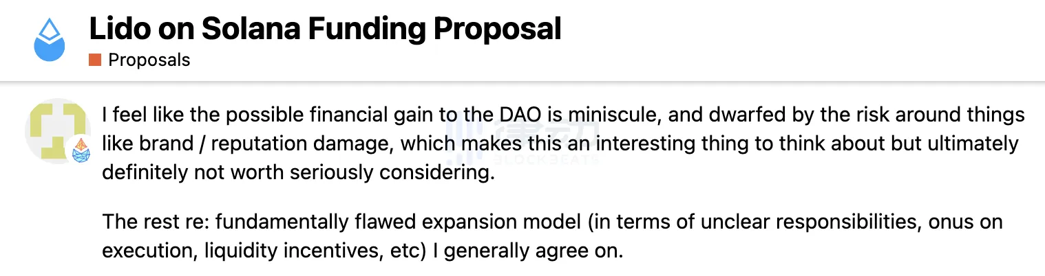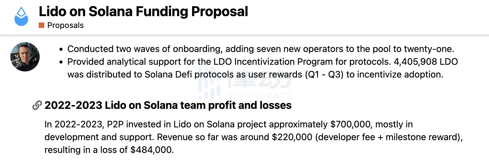 事实上,Lido 退出 Solana 在 9 月便已初见端倪。9 月 5 日,Lido on Solana 项目团队向 Lido DAO 社区提交了一份提案,寻求财务支持以继续其在 Solana 上的发展努力。其在提案中表示,「自 2022 年 3 月从 Chorus One 接手项目以来,团队已在产品和业务发展方面取得了显著进展。然而,由于 2022-2023 年团队在 Lido on Solana 项目上的投资约为 70 万美元,而收入仅为 22 万美元,导致了 48.4 万美元的亏损。」