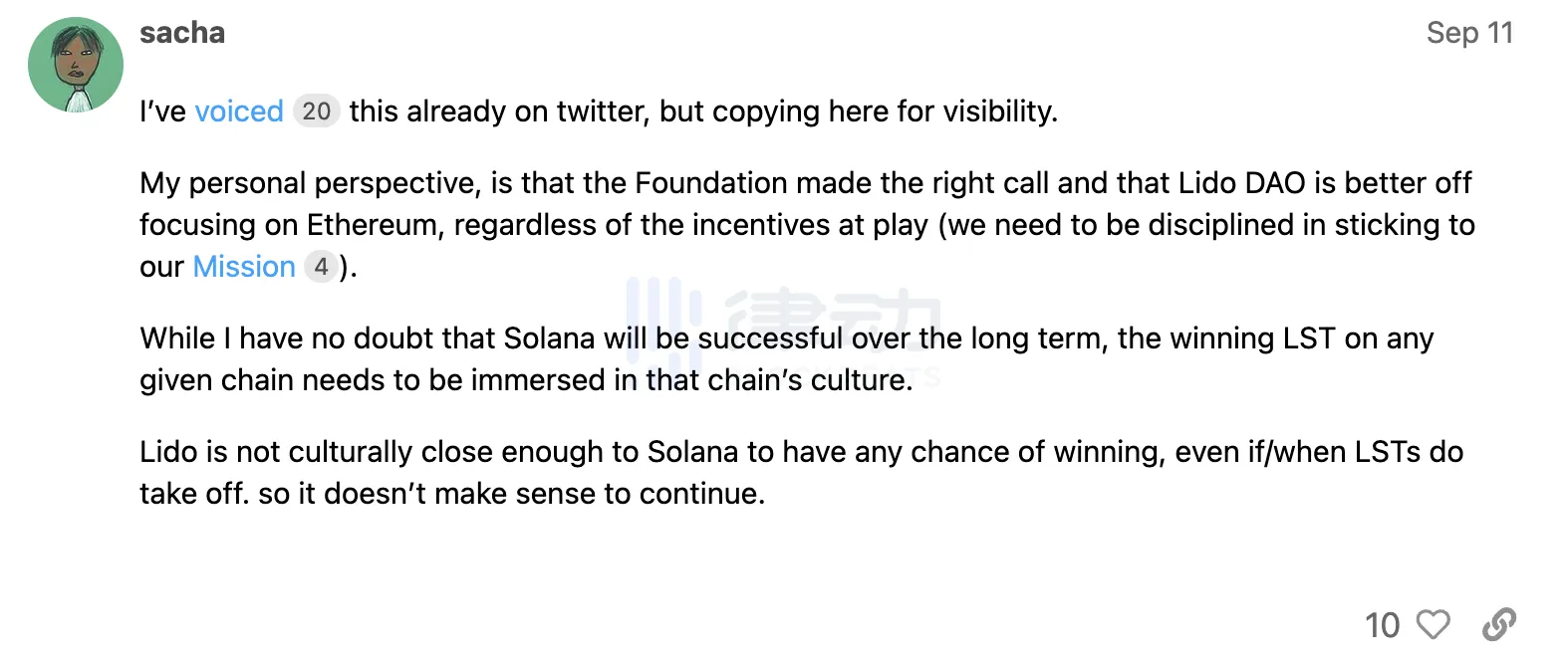 部分用户从项目基因和调性上分析 Solana 和 Lido 继续融合的可能性:「我个人的观点是,基金会做出了正确的决定,Lido DAO 最好专注于以太坊,无论其动机如何。虽然我毫不怀疑 Solana 从长远来看会取得成功,但任何特定链上的获胜 LST 都需要融入该链的文化。」