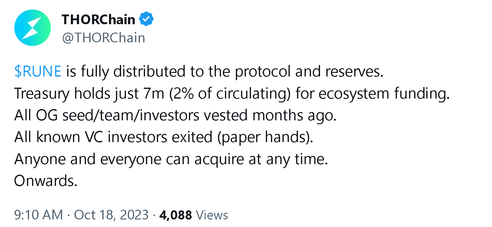 消息,10 月 18 日,去中心化跨链交易协议 THORChain 宣布其代币 RUNE 已完全分配给协议和储备。财政部仅持有 700 万(流通的 2%)用于资助生态系统。所有 OG 种子/团队/投资者的代币均已在数月前解锁,所有参与的风险投资者均已退出。
