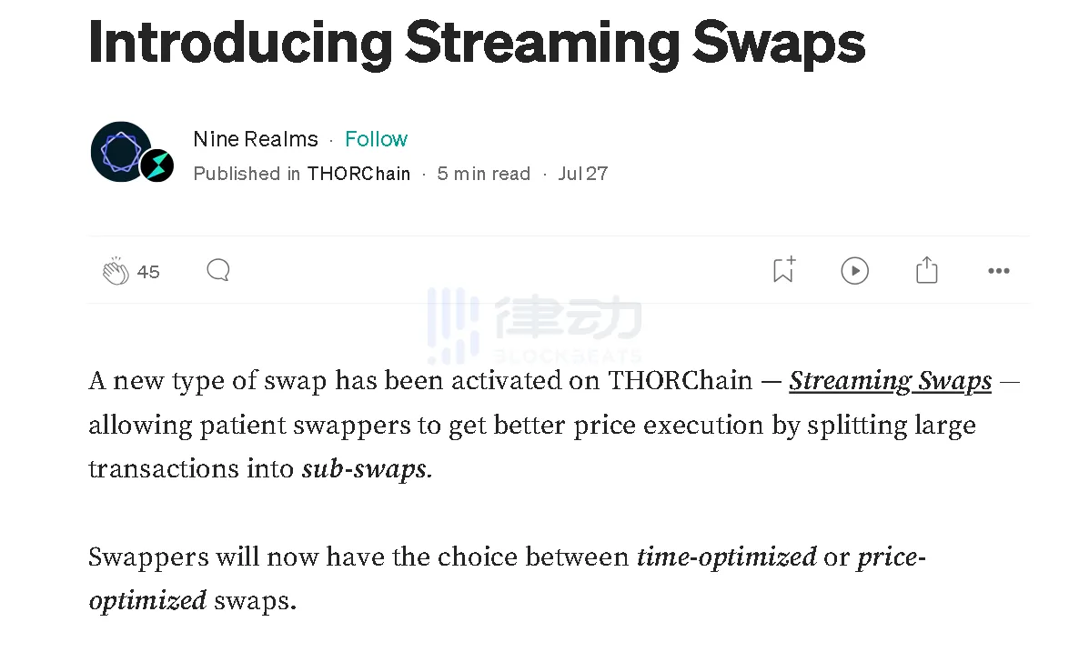 7 月 27 日,THORChain 宣布推出 Streaming Swaps,允许用户通过将大宗交易拆分为子交易以获得更好的执行价格,用户可以在时间优化或价格优化间进行选择。