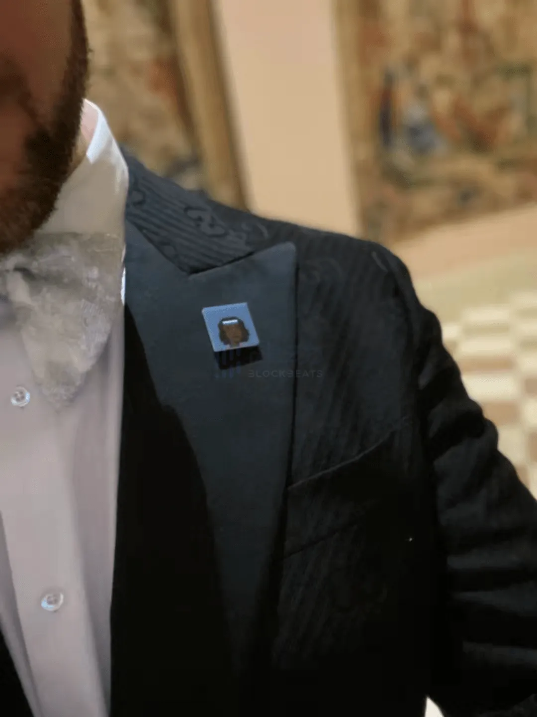 从 NFT 属性选择中不难看出他对妻子的爱。发带、肤色、五官、配饰等属性在很多方面与小威廉姆斯有契合之处。戴发带的 Punk 仅有 406 个,外加棕色皮肤、女性等属性,数量更少。他买下其中 7 个,将其中一个作为礼物送给妻子,并将其制成胸针与妻子共同参与晚宴。