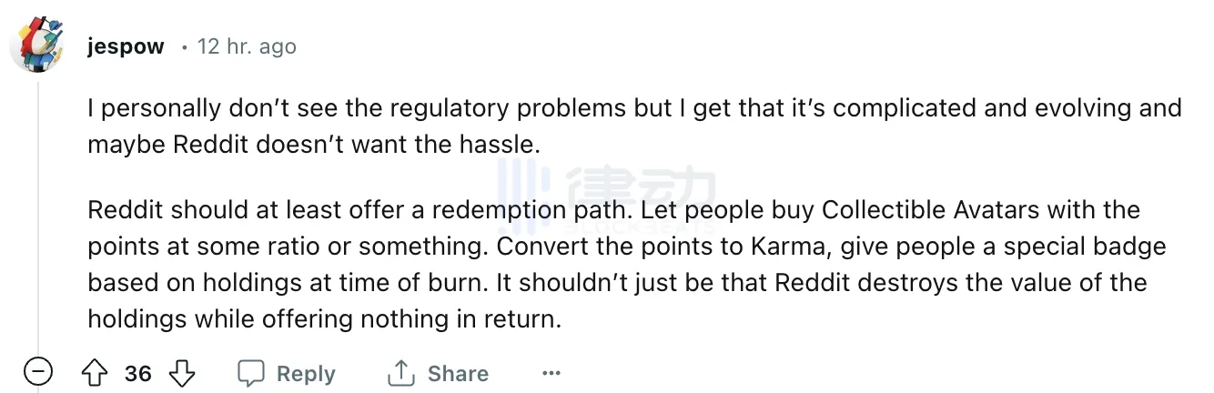 在 Jesse Powell 看来,Reddit 至少应该提供一个补偿办法和赎回路径。让人们以某种比例或其他比例购买带有积分的收藏头像。不应该只是破坏了所持股份的价值,同时又不提供任何回报。