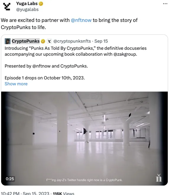 9 月 15 日,Yuga Labs 宣布与设计公司 Zak Group 合作推出「Punks As Told By CryptoPunks」系列纪录片,第一集将于 2023 年 10 月 10 日播出。