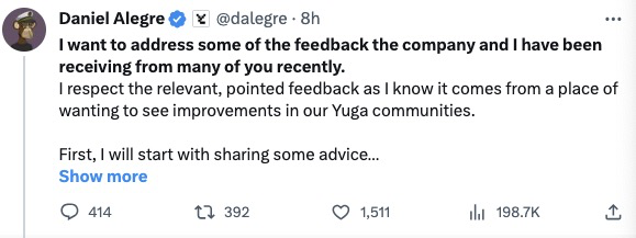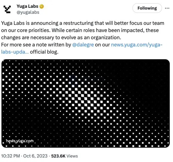 10 月 18 日,Yuga Labs 首席执行官 Daniel Alegre 发表了一篇长推,表示公司的重组已经完成。
