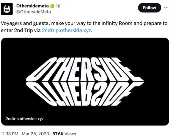 今年 3 月 26 日,Yuga Labs 宣布上线「Otherside:2nd Trip」活动,Voyagers 和受邀访客需前往 Infinity Room 并准备进入 2nd Trip。在此前对活动的介绍中,Yuga Lasb 称此次更新将引入全新游戏环节和新的机制,并提供更多游戏化选项和高能娱乐性,BAYC、MAYC 和 Meebits 持有者均可以在游戏里中直接使用 NFT 化身。