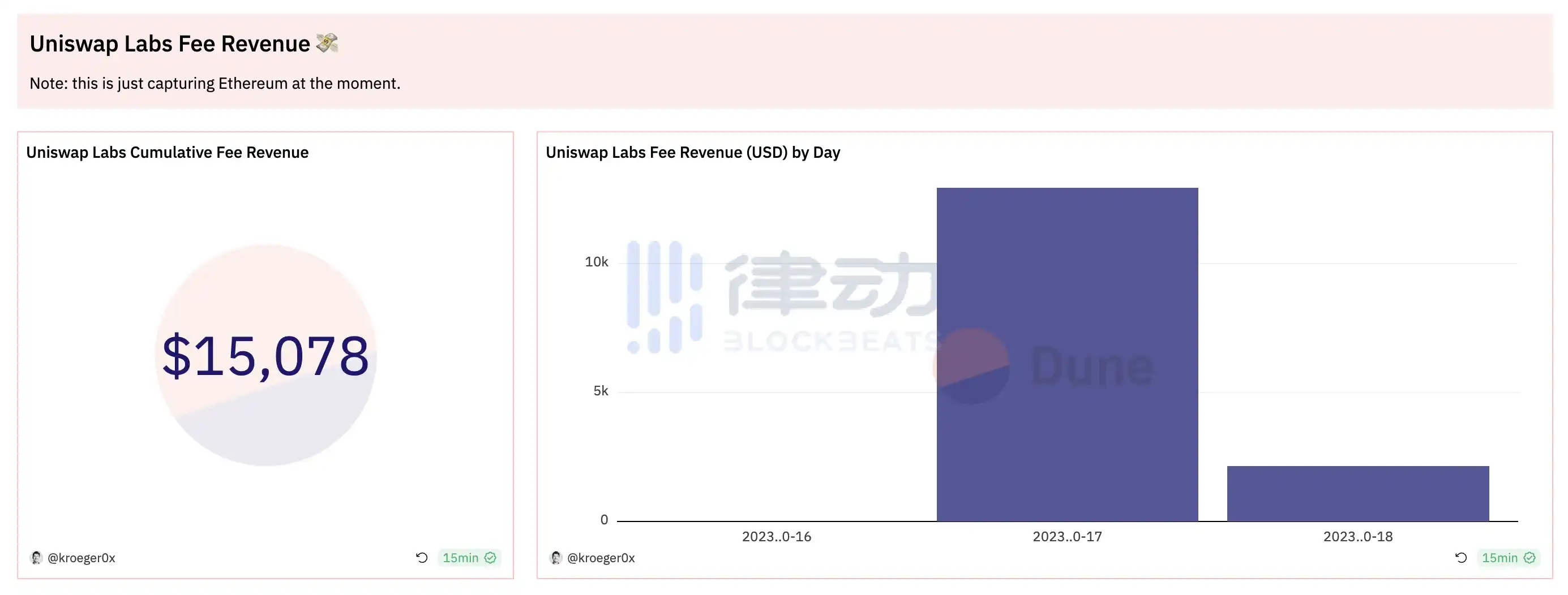 据 Dune 数据显示,Uniswap 已开始收取前端交易费用,目前已获得收入约 1.5 万美元。