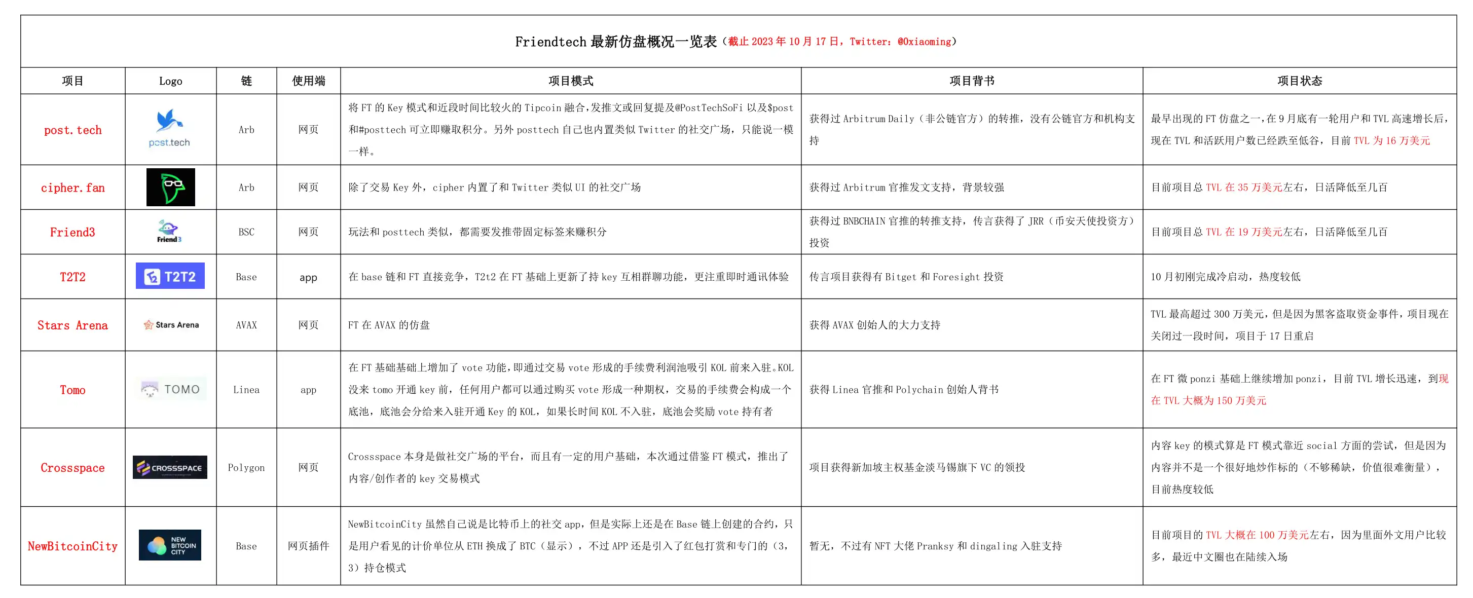 FT 仿盘模式多种多样,到目前不下于 10 个 FT 仿盘在运营,有些是将 FT 和推文标签融合,走流量曝光打法,例如 posttech,Friend3。有项目是走机构或者公链背书吸引撸积分空投的打法,例如 T2T2,Stars Arena。
