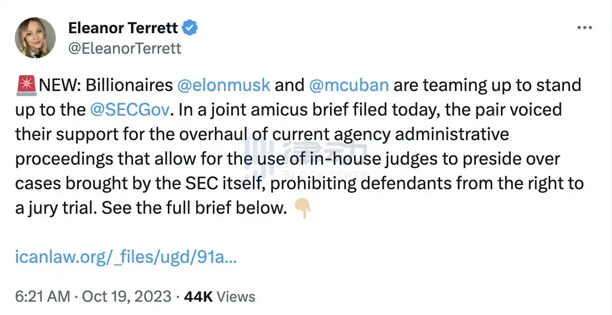 福克斯记者 Eleanor Terrett 在社交平台表示,亿万富翁 Elon Musk 和 Mark Cuban 正在联手对抗美国 SEC。