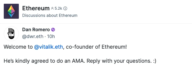 10 月 18 日,以太坊联合创始人 Vitalik Buterin 在基于 Farcaster 的社交媒体平台 Warpcast 上进行了一场开放式 AMA。