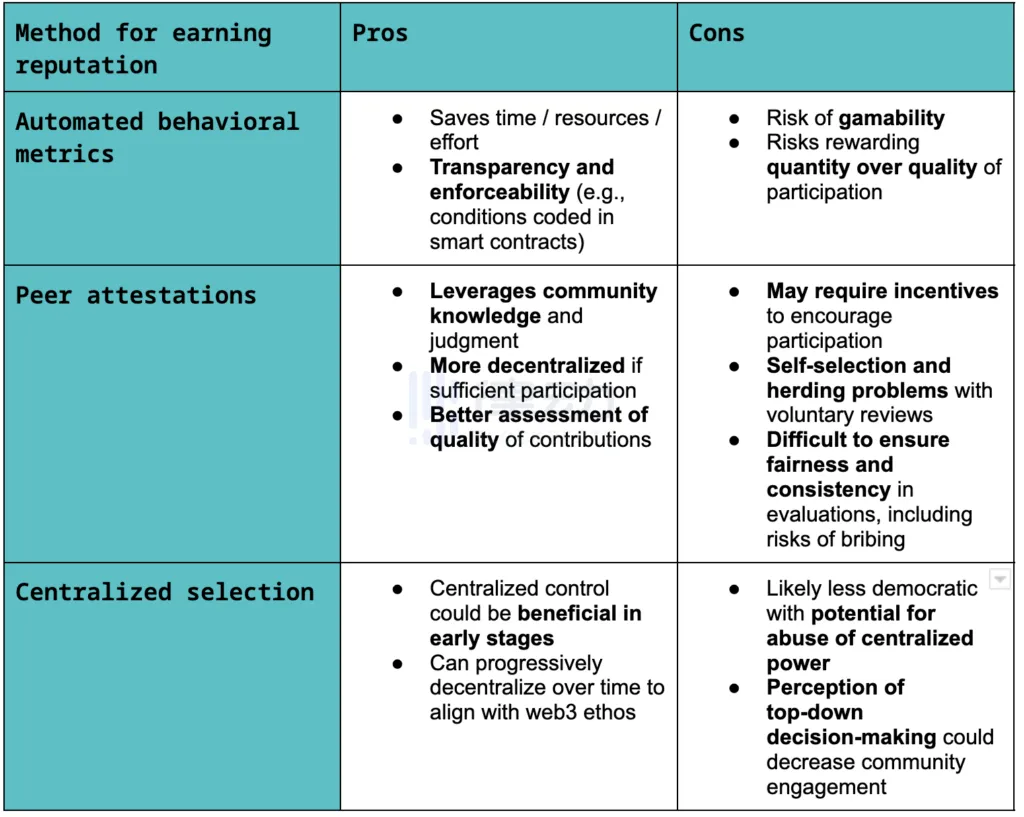 由于声誉系统不能在公开市场上简单购买,设计声誉奖励如何获得的空间很大。下表总结了生态系统参与者可以获得声誉的不同方式的优缺点:
