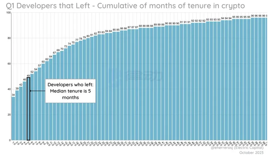 在加密领域工作 1 年以上的开发者继续贡献,而许多新手则离开了