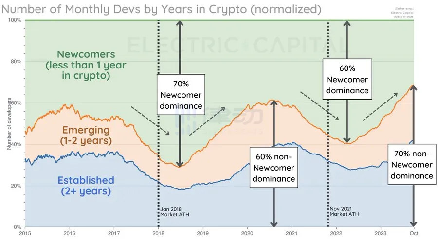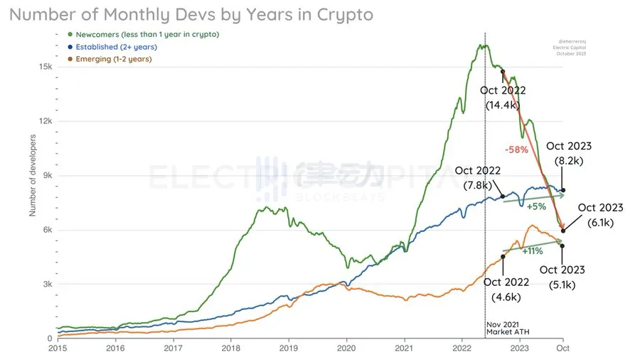 在 2021 年 11 月高峰之后的 23 个月,新兴和成熟开发者的比例更是达到了 70%。