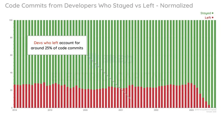 在加密领域中,代码提交贡献的绝大部分来自于留在该领域的开发者: