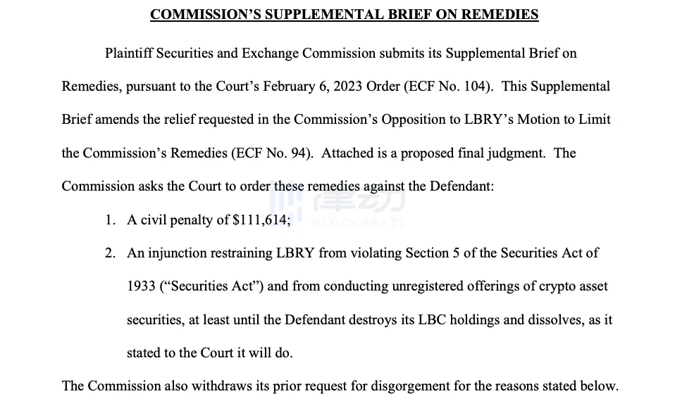 然而,这也并不意味着 LBRY Inc. 的胜诉。5 月,据一份法庭文件显示,SEC 寻求修改其针对 LBRY Inc. 的 2200 万美元处罚,要求法院对其处以 111,614 美元民事罚款。因为 SEC 认为 LBRY Inc. 已停止运营,没有资金支付更高的罚款,因此选择降低罚款金额。
