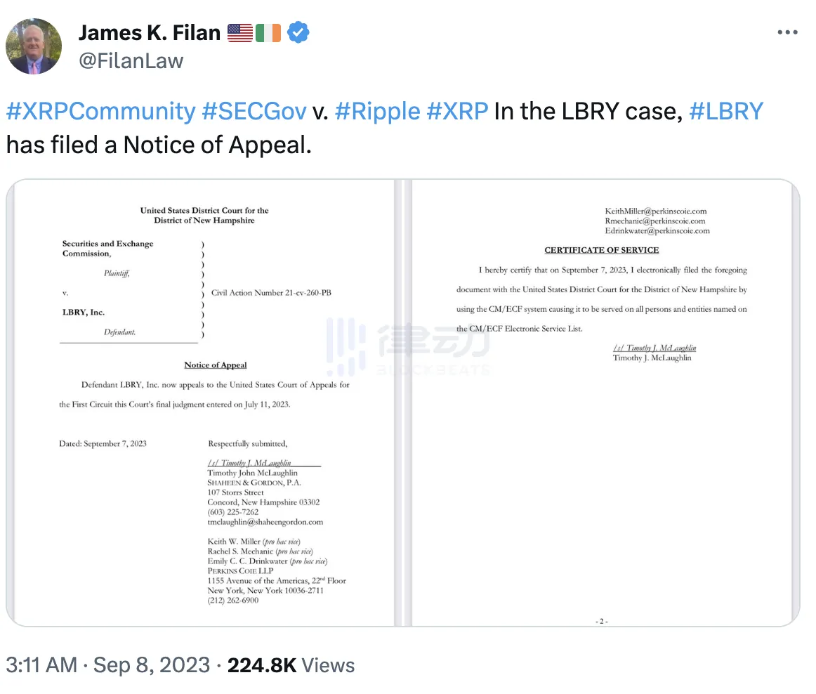 但 LBRY Inc. 似乎并不打算安心走向清盘,于是希望将这一案件上诉至更高的法院。9 月 8 日,据美国前联邦检察官 James K. Filan 在社交平台上分享的一份法律文件显示,LBRY Inc. 已发出上诉通知书,计划就 SEC 指控其违反证券法的案件,向美国第一巡回上诉法院提起上诉。