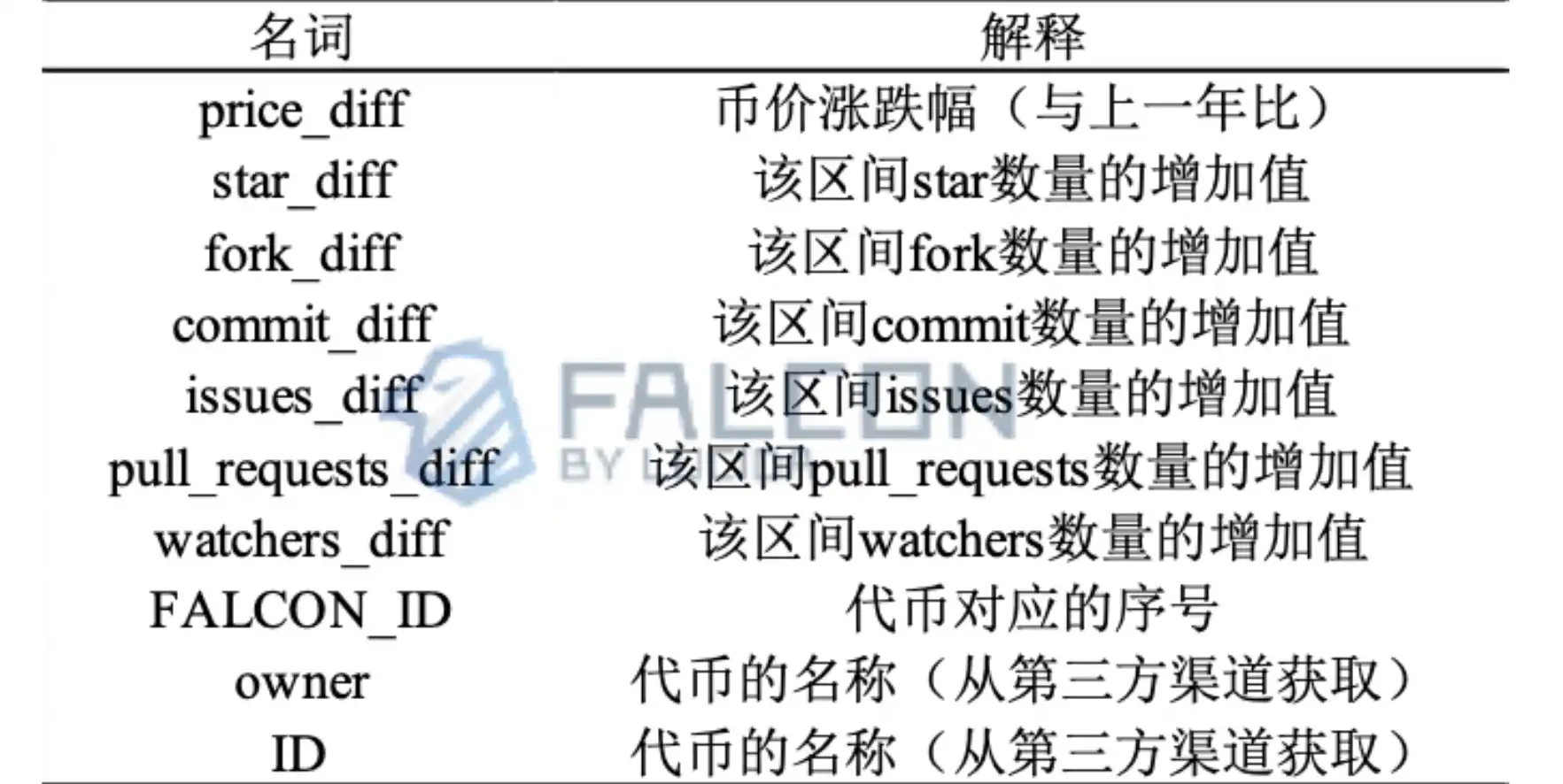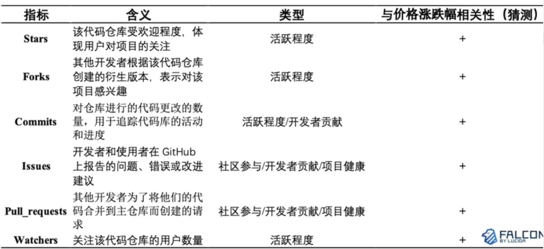 因此,**Falcon 将 GitHub 的 6 个因子作为衡量「团队在做事」的量化标准,具体包括:Star、Fork、Commit、Issues、Pull requests、Watchers。**以下为六个因子的具体含义和类型