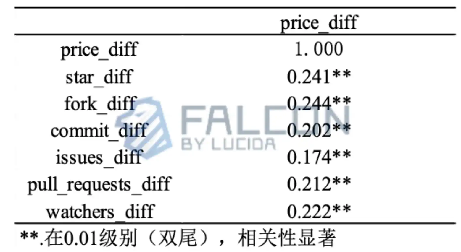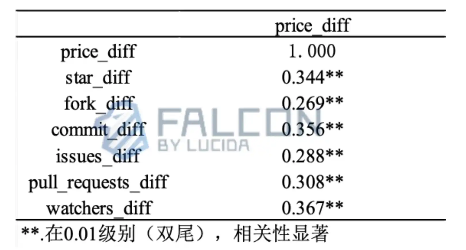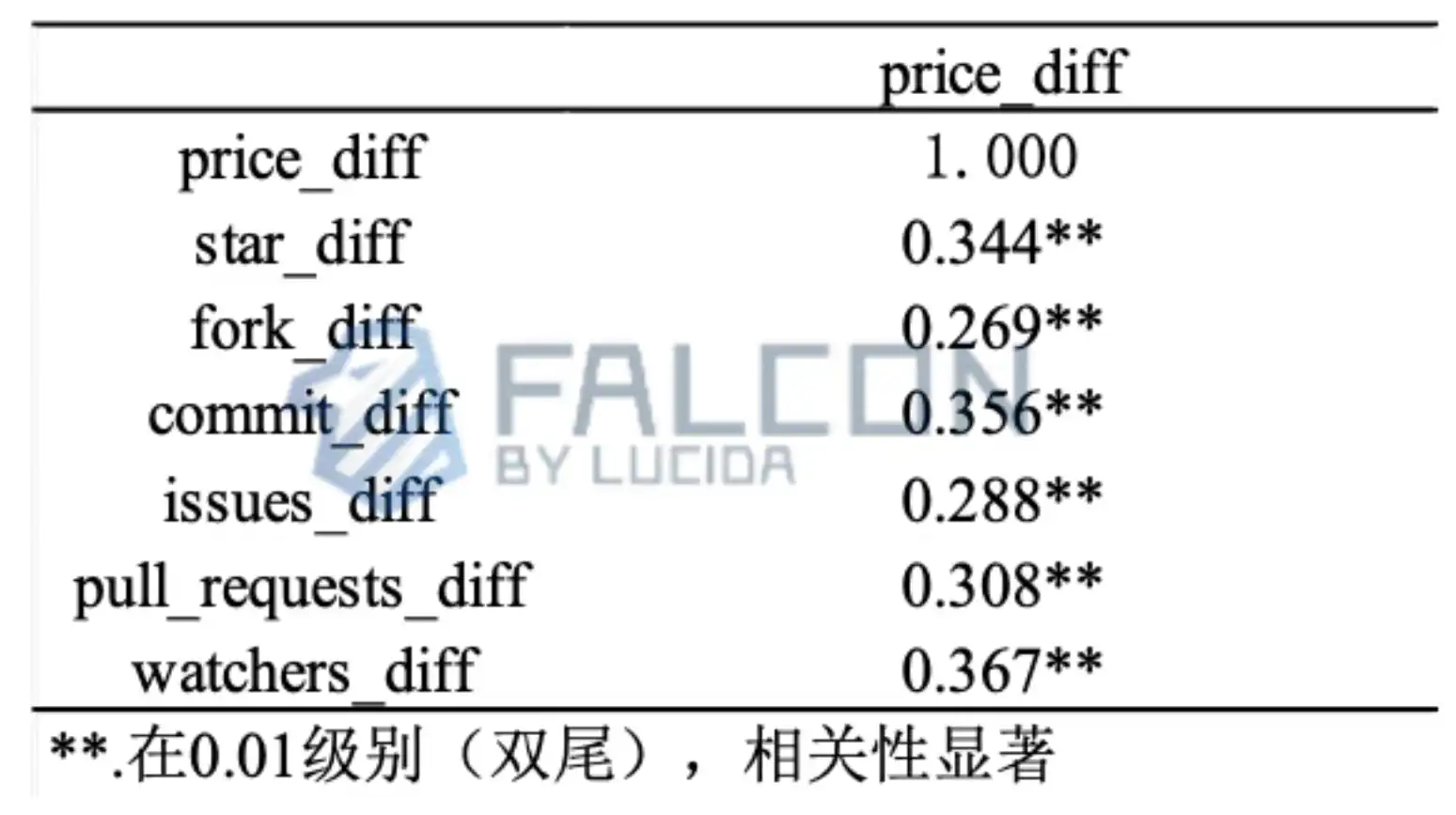 GitHub 数据的 5 个因子对于币价在熊市的抗跌有正向作用。由表易得,star、fork、issues、pull_requests、watchers 与 price 的相关性系数值都在 0.260 左右,并都呈现出 0.05 水平的显著性,统计学意义上表明 5 因子与币价都具有正相关性。