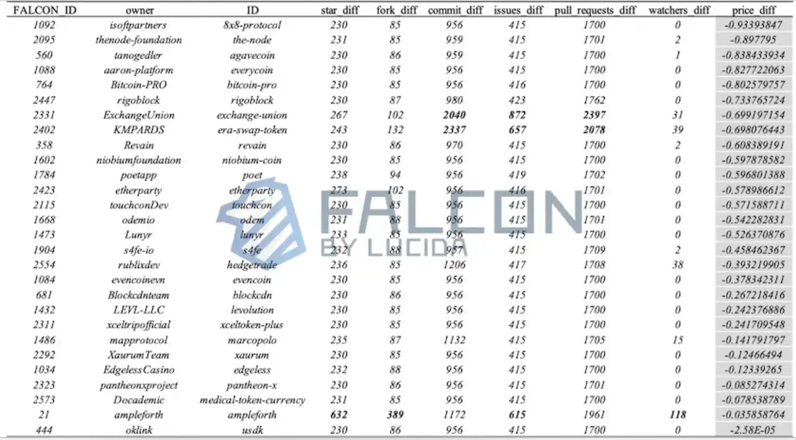 该区间币价涨幅超过平均涨幅值(黑色加粗)的币价及其对应的 GitHub 数据六因子的统计情况: