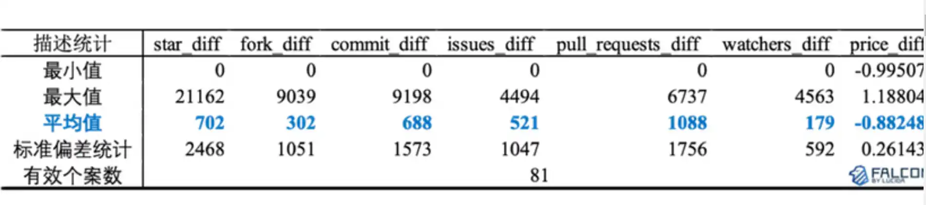 GitHub 数据六因子及币价涨跌幅的描述统计: