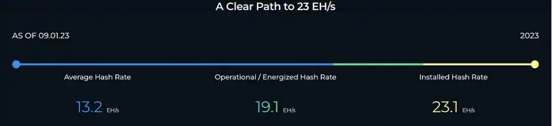 Marathon 作为在网络算力中的份额最大的上市矿企,一直在不断增加其 EH/s 以保持挖矿竞争力。其运营哈希率从 22Q3 的 13.2EH/s 增加至 23Q2 的 17.7EH/s,今年目标是到达 23.1EH/s。