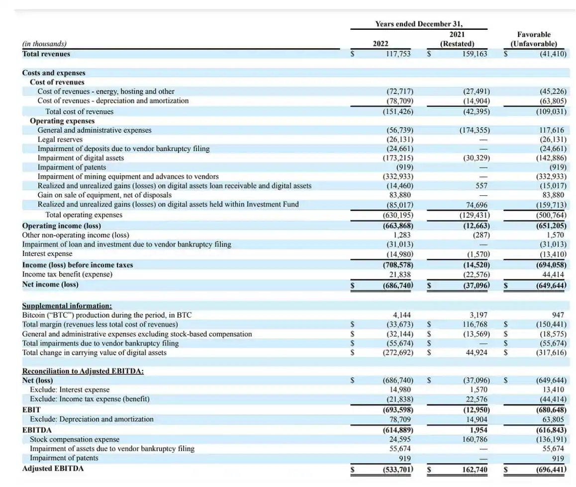 2022 年度 Marathon 录得了 6.87 亿美元的净亏损,而 2021 年同期录得了 3709 万美元的净亏损。亏损增加了 6.49 亿美元,主要是 Marathon 的数字资产的账面价值总减少了 3.18 亿美元,比特币挖掘设备和向供应商支付的预付款项总计减值了 3.33 亿美元。