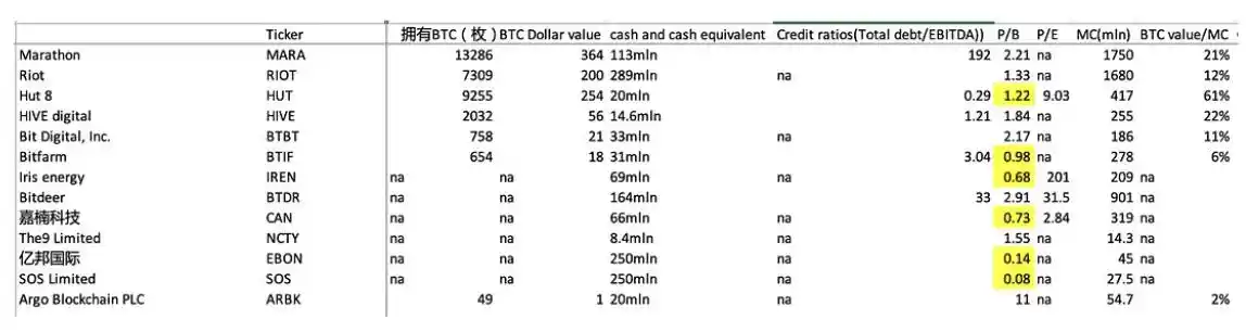 P/B 来看,最被市场低估的为 SOS limited(0.08), 亿邦国际(0.14),嘉楠科技(0.73),Iris energy(0.68), Bitdeer(0.98), HUT8(1.22);但这其中大于 0.5 才能视为运营稳健,没有破产威胁。