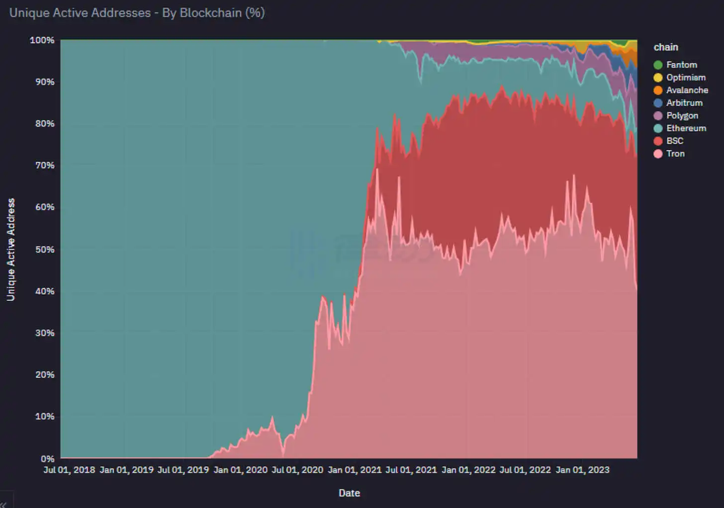 大约 40% 的在链上发送稳定币的活跃地址都在 Tron 上: