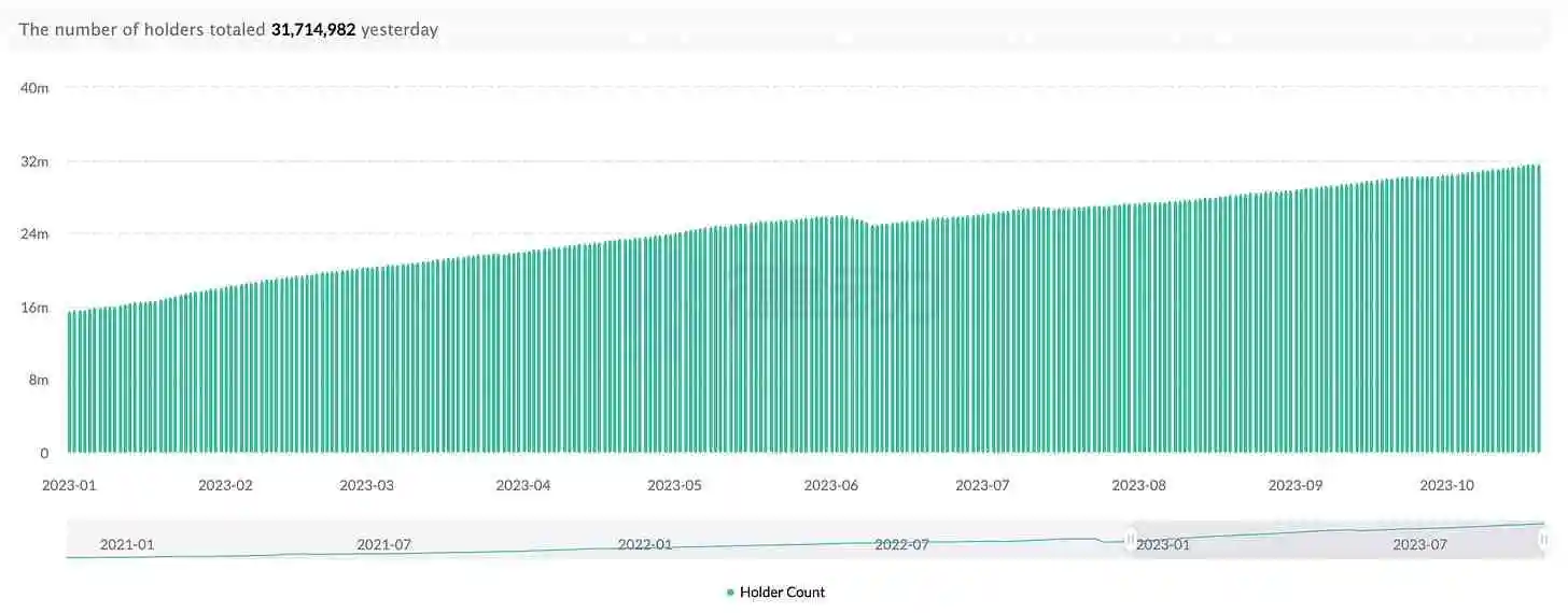 Tron 上持有 USDT 的钱包数量今年迄今增加了约 2 倍,从约 1600 万增加到约 3200 万: