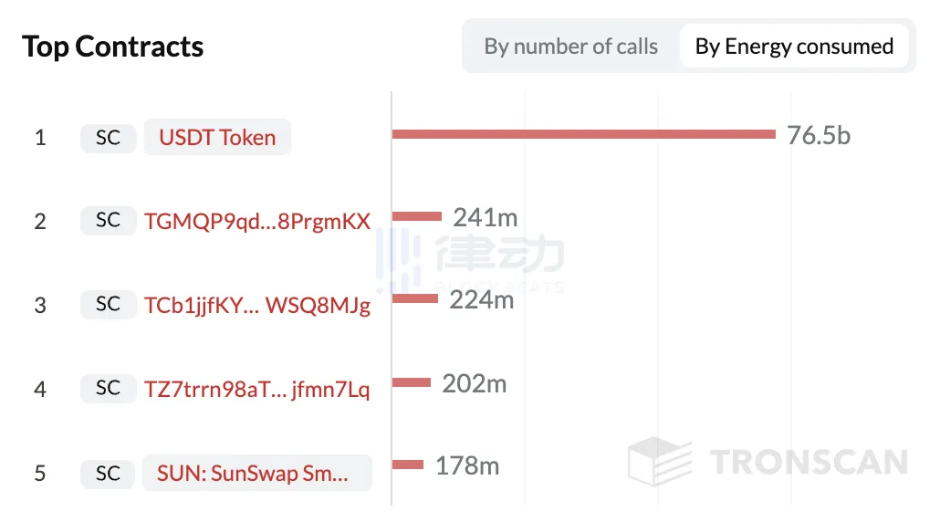 带宽和能量在实践中如何运作的基本机制是一个相当复杂和动态的系统,但最终的影响是网络的更多使用导致更多的 TRX 需要在短期内购买和销毁,以及购买和质押长期的基础。本质上,当能源需求超过可用能源时,TRX 就会被烧毁。同样,如果用户没有足够的带宽来进行交易,则每带宽 0.001 TRX 的交易费用将被应用并销毁。USDT 使用量的增长直接推动了 TRX 代币的积极供应动态,因为 USDT 合约是最大的能源消耗者,且遥遥领先: