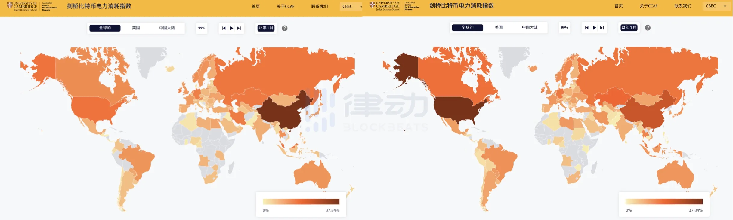 左图:2021 年 1 月;右图:2021 年 12 月。图源:剑桥比特币电力消耗指数