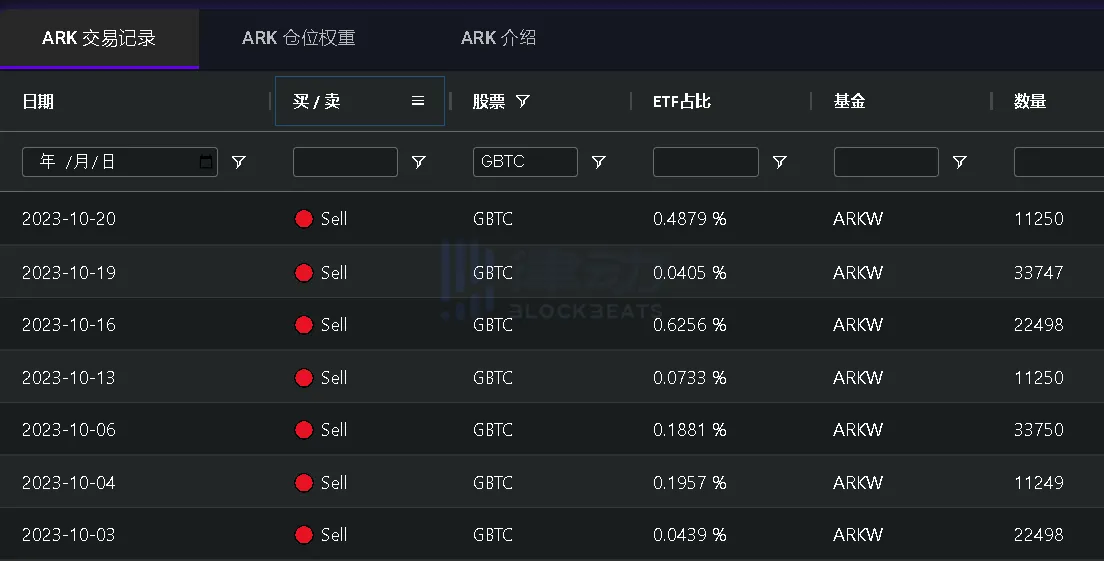 与此同时,值得注意的是,据 ARK 方舟基金持仓数据显示,ARK 方舟基金在 10 月里,累计减持 14.6242 万份 GBTC,没有任何买入。