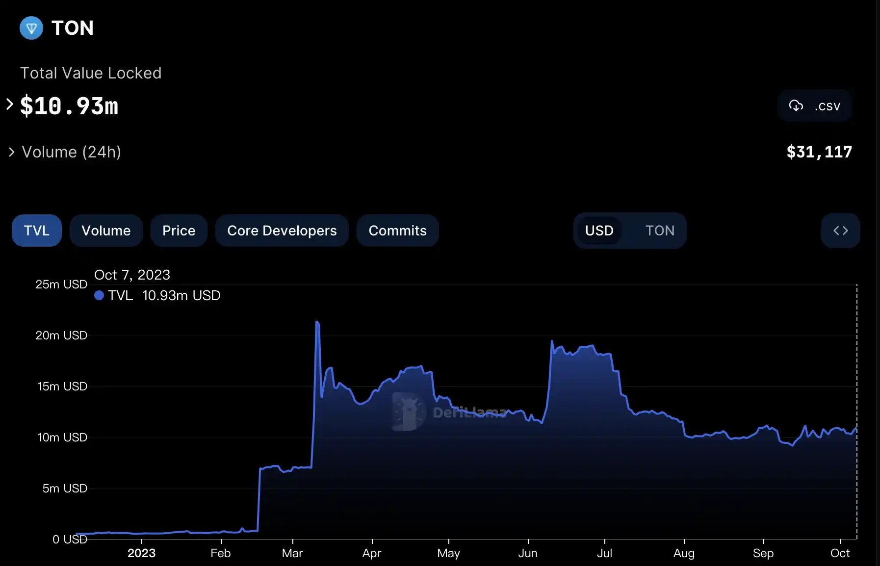 TON 链上有存在 DeFi, GameFi 等各类 Dapp,Defillama 上显示的 TVL 只有 1000 万(2023 年 10 月 7 日)。这个数字高不高对比一下就知道了。