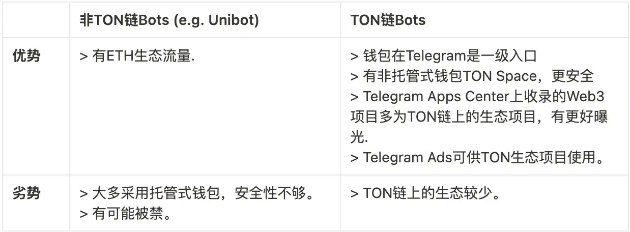 - Telegram bots (类似微信小程序) 有着无需下载、即用即走、体验丝滑、能与 Telegram 好友互动的特点。把 Dapp 做成 Telegram bots 能更容易触达到 Web2 的用户。微信小程序的成功也让我们对于 Telegram bots 的成功有着很大的期待。