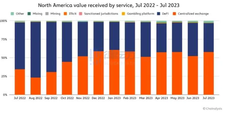 10 月 23 日,Chainalysis 发布《2023 年加密货币地区报告》,报告指出,北美地区目前仍是全球加密活动与交易最大、最活跃的地区。2022 年 7 月至 2023 年 6 月期间北美地区链上收到的加密货币价值估计为 1.2 万亿美元。这一数字占同期全球交易活动的 24.4%。