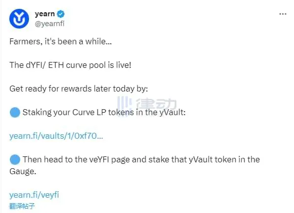 10 月 23 日,据官方消息,DeFi 收益聚合器 Yearn 协议质押奖励代币 dYFI 已在 Curve 上线 dYFI/ETH 交易对。用户可以将 Curve LP 代币质押在 yVault 中,然后转到 veYFI 页面并将 yVault 代币质押在 Gauge 中,以此获得今日的奖励。dYFI/ETH gauge 在上一轮中获得了大多数选票,并将获得 39.23% 的奖励。