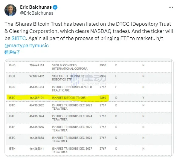 10 月 24 日,彭博社 ETF 分析师 Eric Balchunas 发文称,资管巨头贝莱德子公司 iShares 比特币信托已在 DTCC(美国证券集中保管结算公司)上市。股票代码将是「IBTC」。这是将现货比特币 ETF 引入市场的过程的一部分。