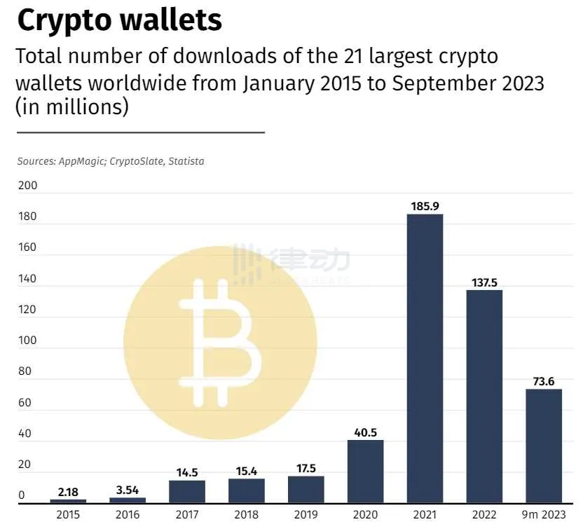 10 月 23 日,根据 AltIndex.com 提供的数据,加密钱包在今年前 9 个月的下载量为 7360 万次,包括 Coinbase、Blockchain.com、Metamask、Trust 和 Binance 等。这一数字远低于去年同期的 1.097 亿次下载量,同比下降 32%。