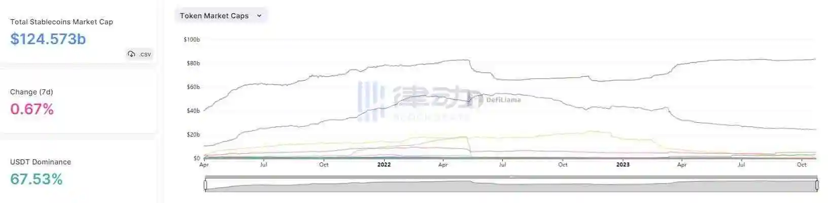 10 月 23 日,据 DefiLlama 数据,当前稳定币总市值达 1245.7 亿美元,其中 USDT 占比达 67.53%。 稳定币总市值过去一周增幅为 0.67%。