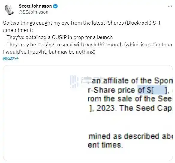 北京时间 10 月 24 日凌晨 00:24,美国金融律师 Scott Johnsson 在其社交平台表示,通过研究贝莱德提交的 S-1 修正案,发现贝莱德已获得为比特币现货 ETF 发布准备的 CUSIP(Committee on Uniform Securities Identification Procedures)Number。
